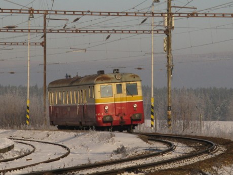 Téměř padesátiletý veterán českých kolejí - 831.187 - odveze spolehlivě svůj dopolední vlak i v dvacetistupňovém mrazu. Na snímku přijíždí do stanice Chodová Planá 8. ledna 2009. (AUTOR: Andrej Hoffman)